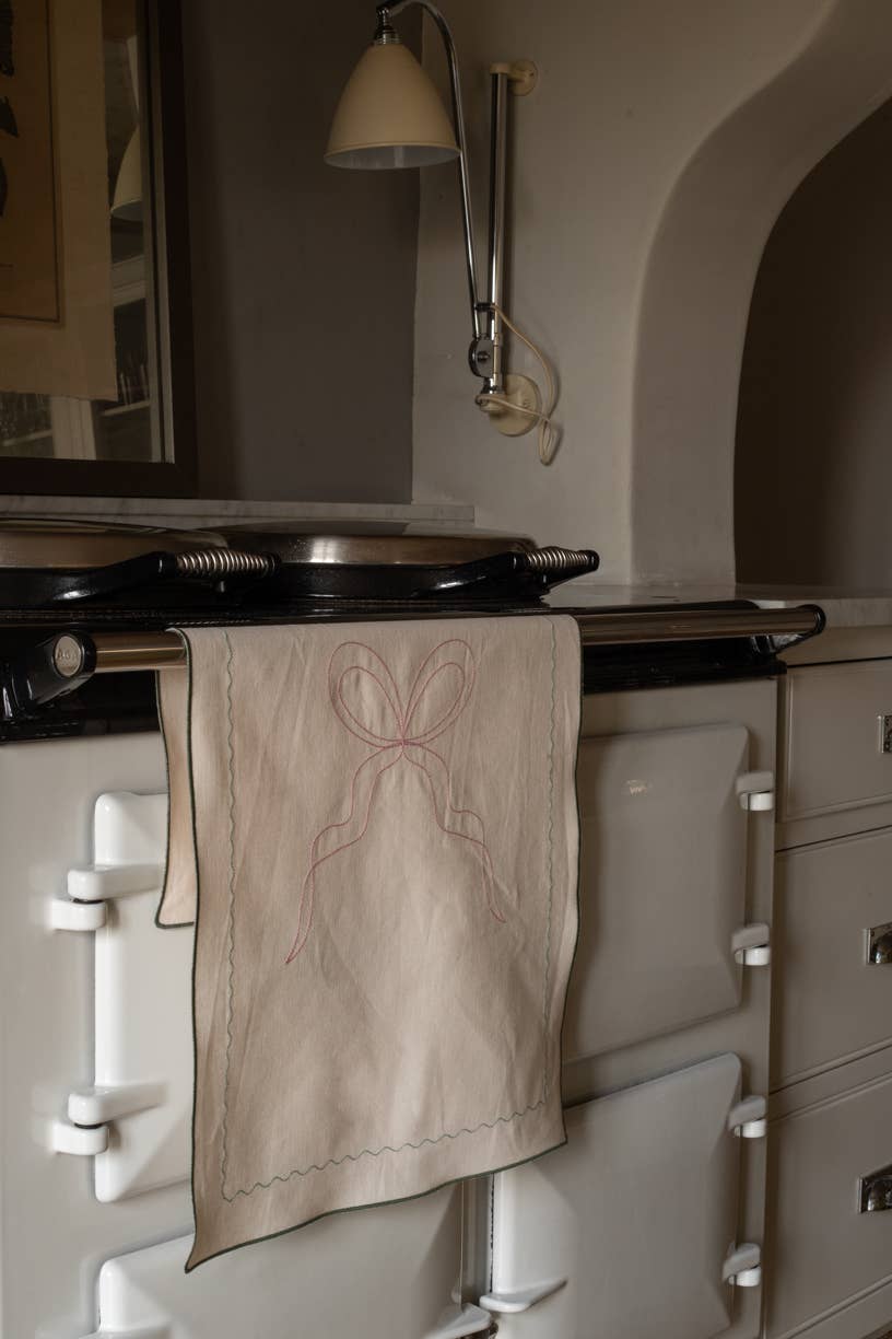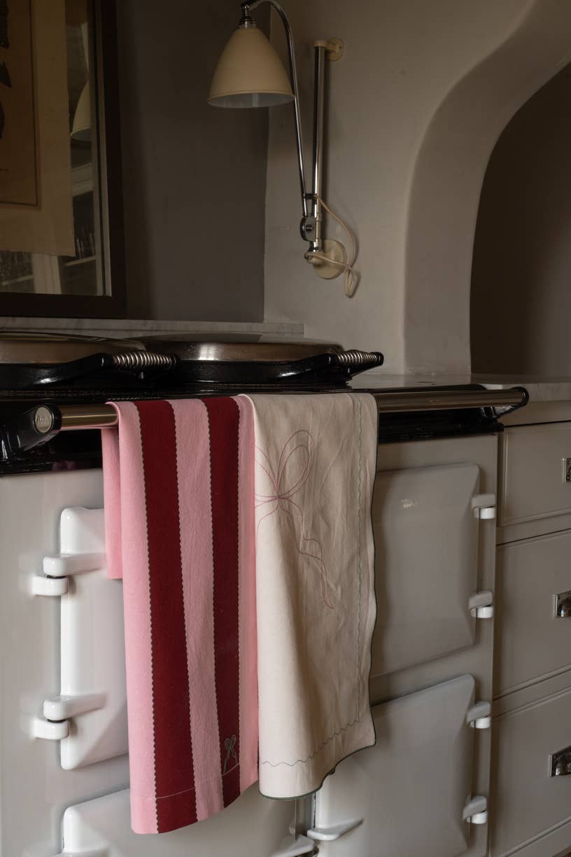 Dress your kitchen in style with our 100% organic cotton set of 2 Tea Towels. Featuring a playful pink and red stripe, zig zag shapes, dark green edging and embroidered bow, and made from soft and absorbent cotton, with a loop for hanging, our tea towels are both practical and beautiful. Pair with our Double Oven Gloves to dress your kitchen beautifully for the big day!