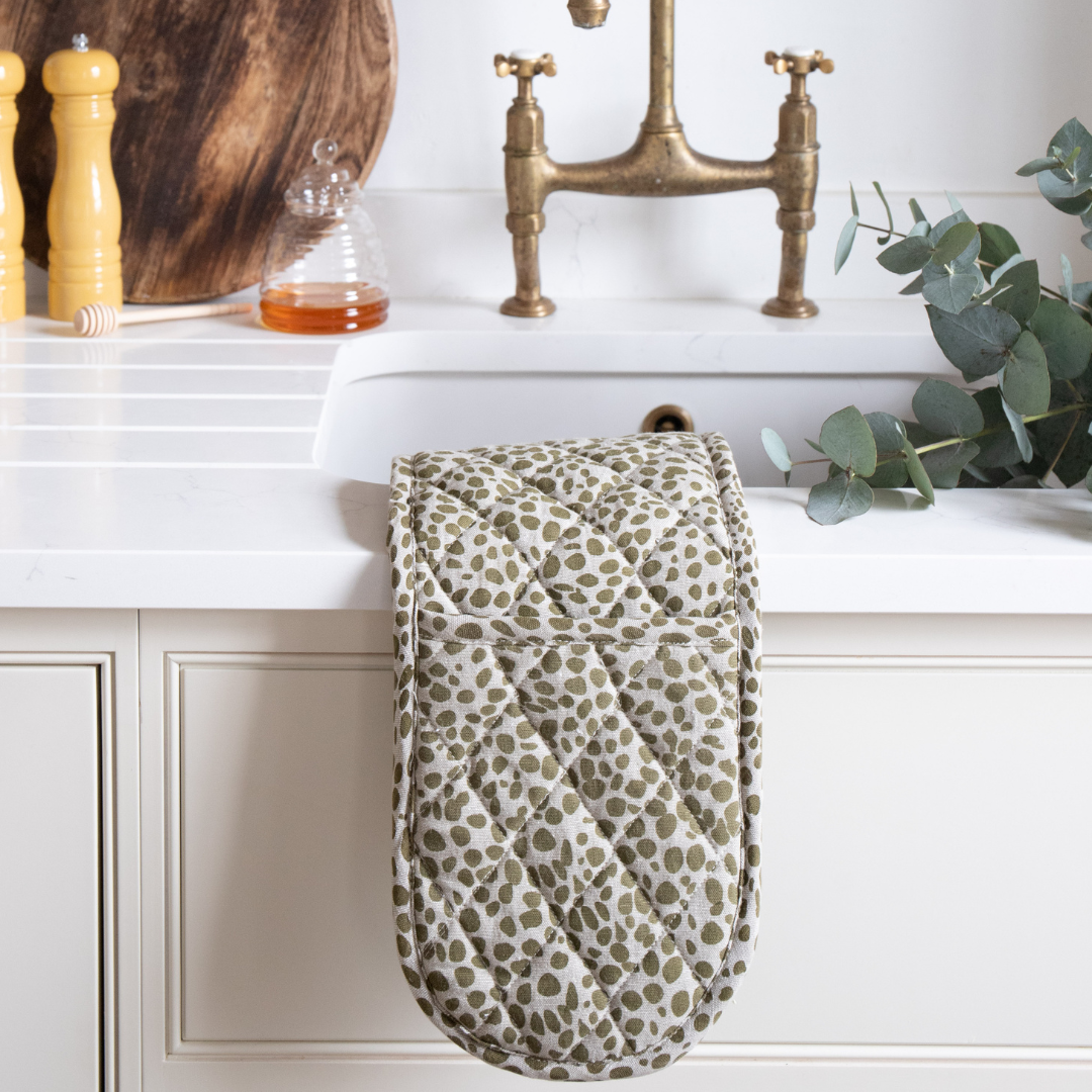 A 100% cotton double oven glove with thick cotton wadding, screen printed with a hand drawn spot design in pale blue on a natural background. Has a little hanging loop. Machine washable at 30 degrees.